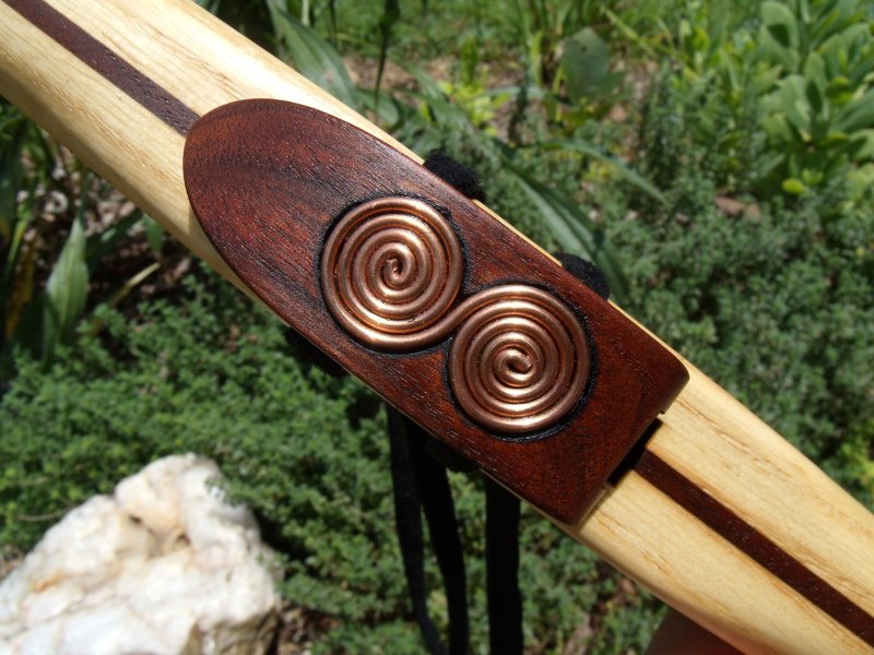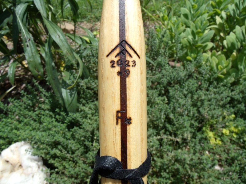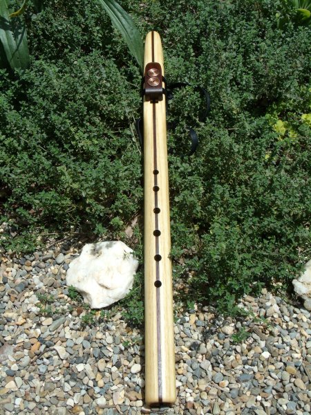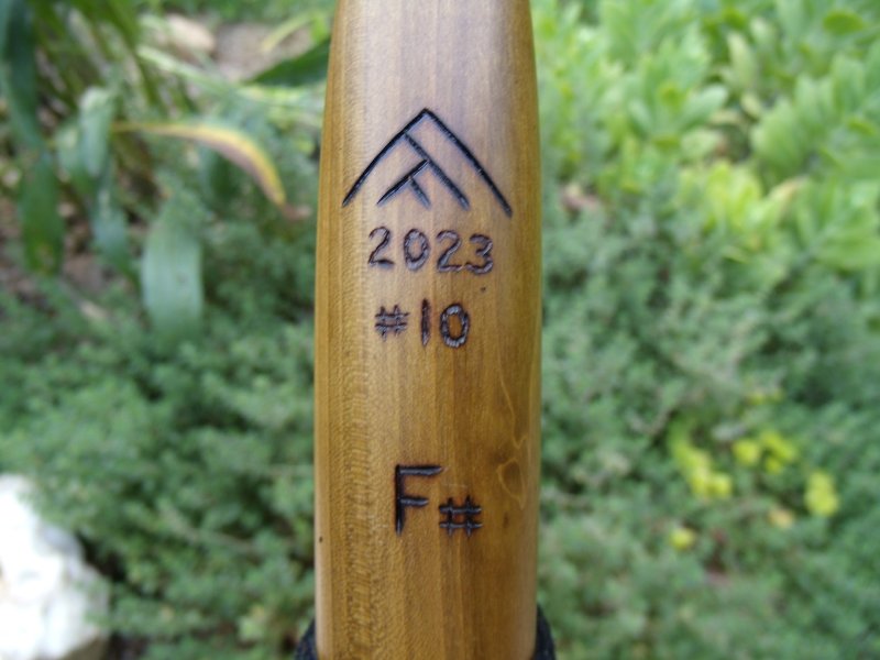 Flute #9 of 2023 | Key: Mid F# (Standard tuning) | Ash w/ Black Walnut Stripe Flute | Black Walnut Block w/ Copper Khaleme Air Element Symbol Inlay | Length: 22.25″ | Price: $400.00 AVAILABLE