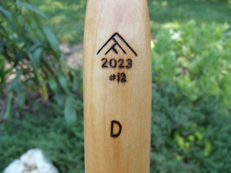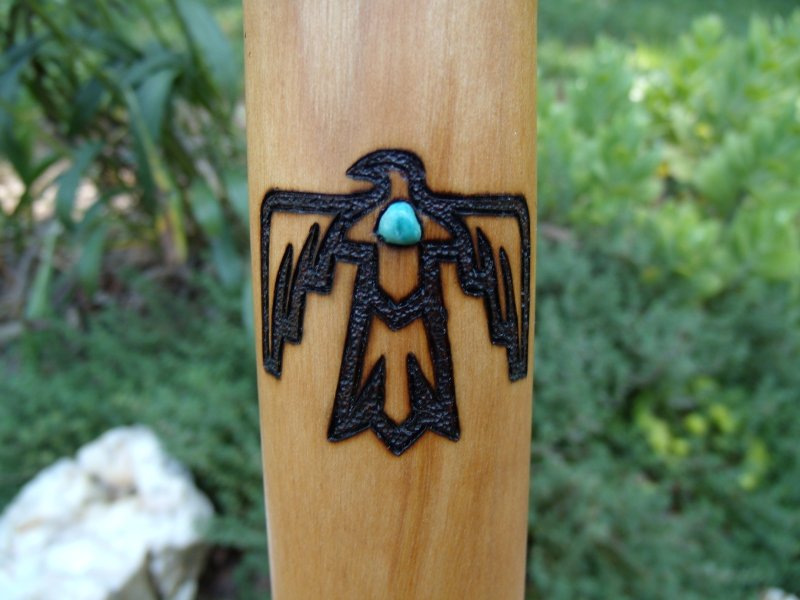 Flute #12 of 2023 | Key: Low D (Standard tuning) | Birch Flute | Myrtle Block | Thunderbird Woodburning w/ Turquoise Stone | Length: 27.25″ | Price: $450.00 SOLD