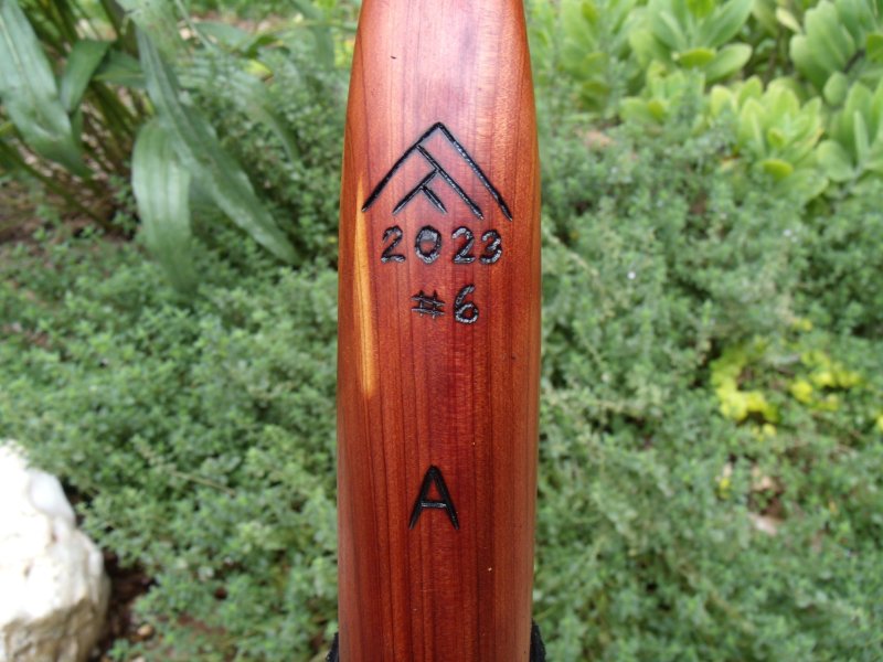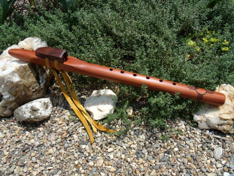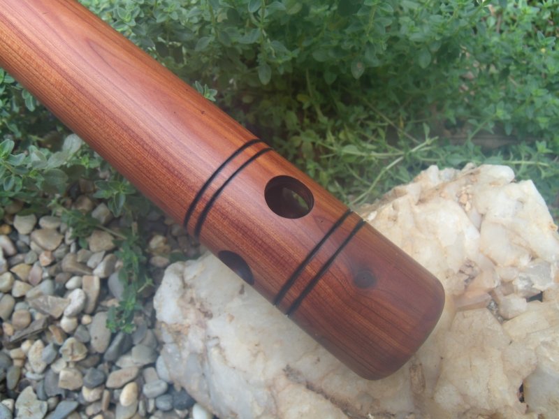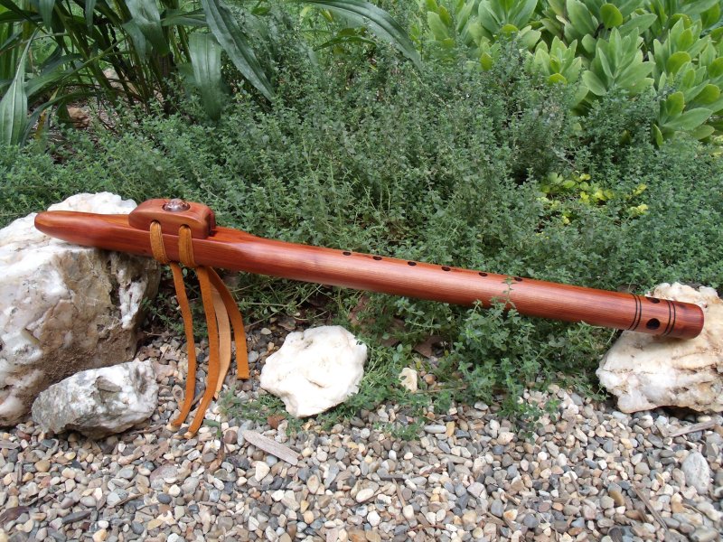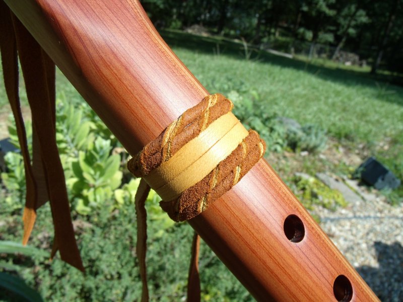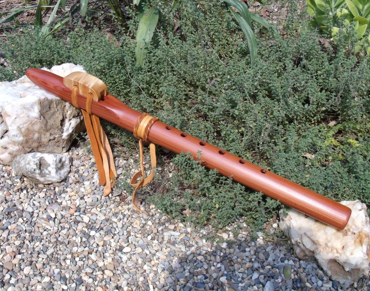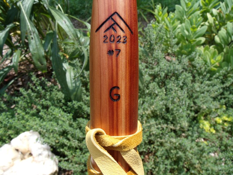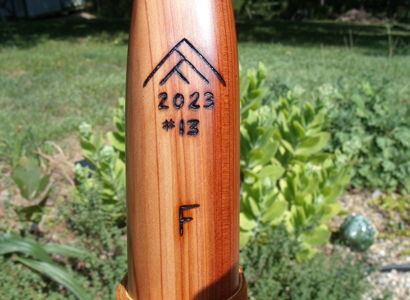 Flute #13 of 2023 | Key: Low F (Standard tuning) | Eastern Red Cedar Flute | Curly Maple Block | Leather Wrap | Length: 23″ | Price: $350.00 AVAILABLE