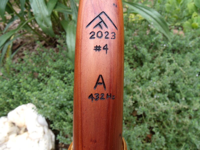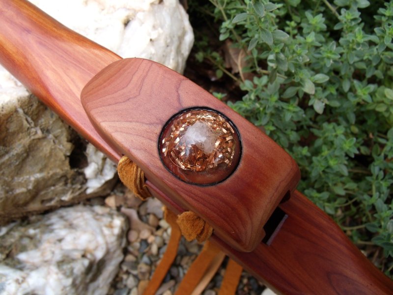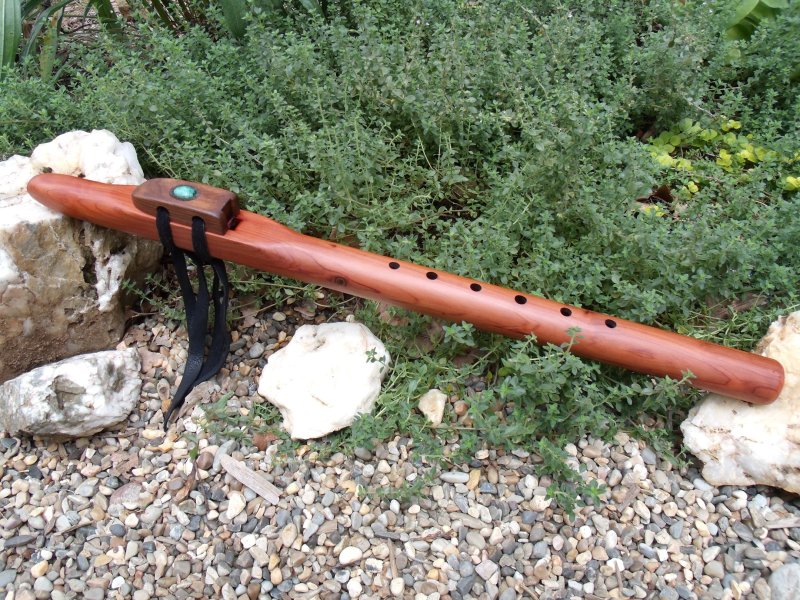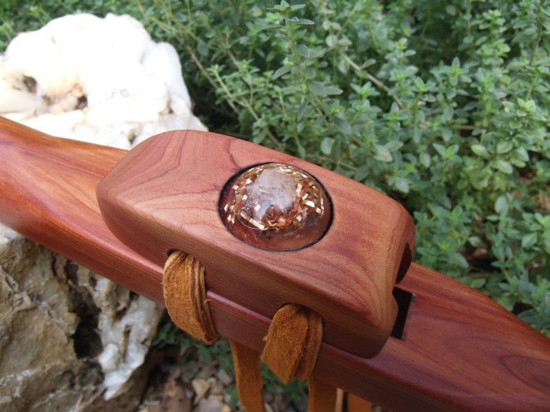 Flute #4 of 2023 | Key: Mid A (432Hz tuning) | Eastern Red Cedar (flute & block) | Orgonite Cabochon w/ Pink Kunzite | Directional Tuning Holes | Burned Rings | Length: 21.5″ | Price: SOLD