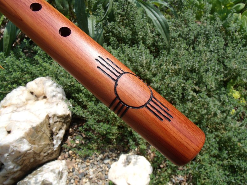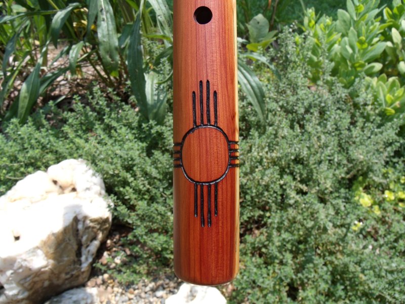 Flute #7 of 2023 | Key: Mid G (Standard tuning) | Eastern Red Cedar Flute | Black Walnut Block | Zia Sun Symbol Burning | Length: 21″ | Price: SOLD